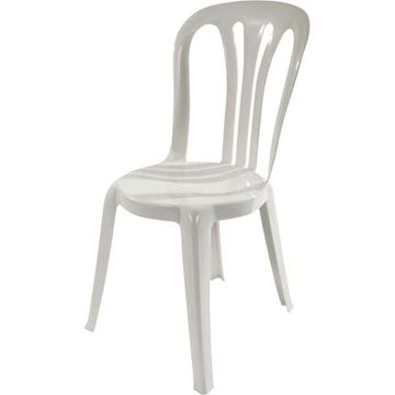 These are our premium chairs. They are made of a durable white resin composite and have a white cushion on top. These come in stacks of 20 on rolling racks and are best delivered due to bulkiness.